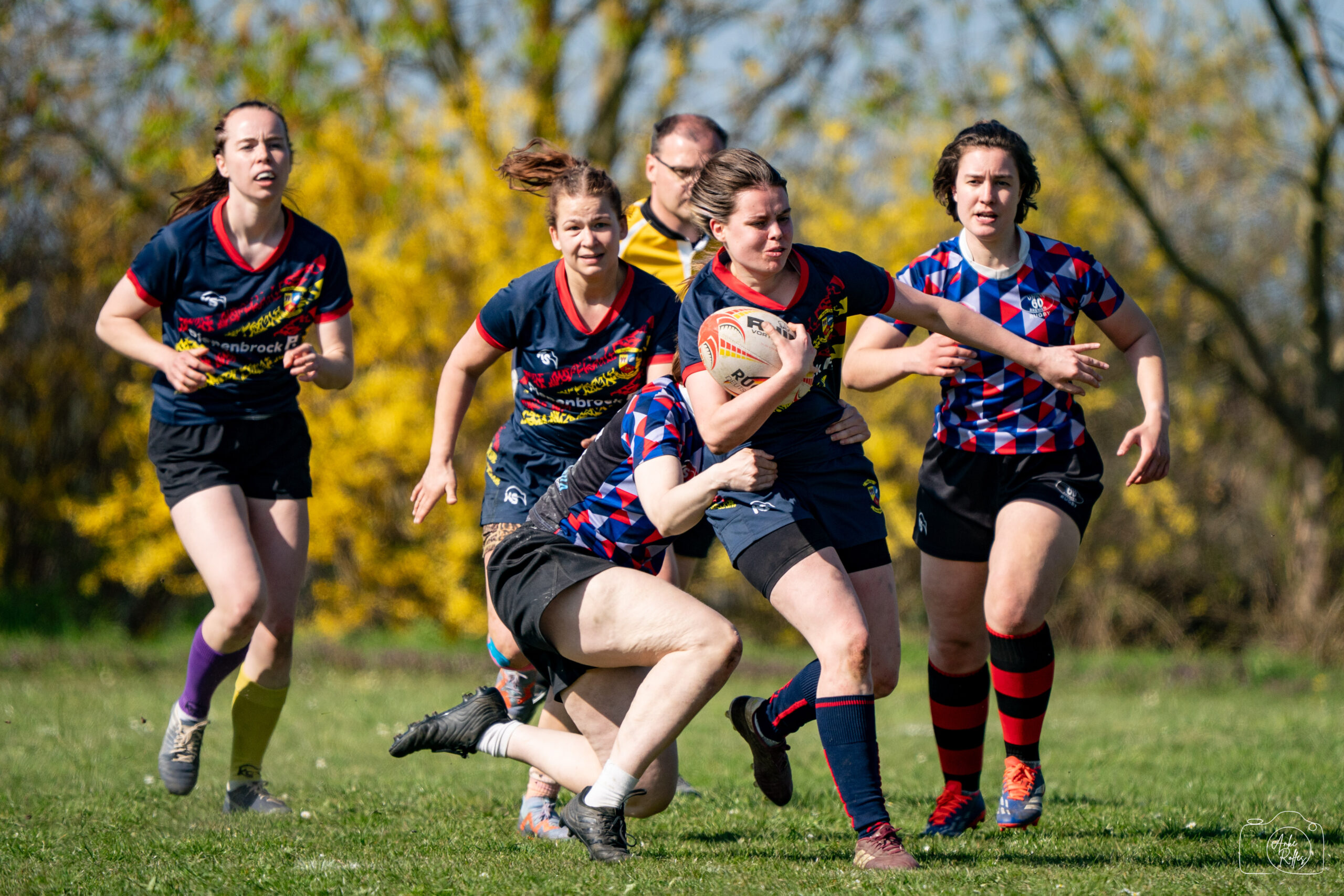Anpfiff ist um 11 Uhr gegen die Dragonettes aus Düsseldorf. Und schon wird es spannend: Beni legt zwei Versuche nach starken Runs. Und verhindert mehrere Versuche der Düsseldorferinnen mit Try-saving-Tackels. Aber die Gegnerinnen sind stark, legen drei Versuche im Spiel. Anna und Liz legen ebenso Versuche – geschafft! Auf dem Feld zeigt sich, dass die Kick-Meisterin Fredda fehlt: nur eine von vier Erhöhungen sitzt. Dennoch starkes Einspringen von Vanessa! Für den Endstand ist das egal: SG BiBo startet mit einem stolzen 22:15 in das Turnier.